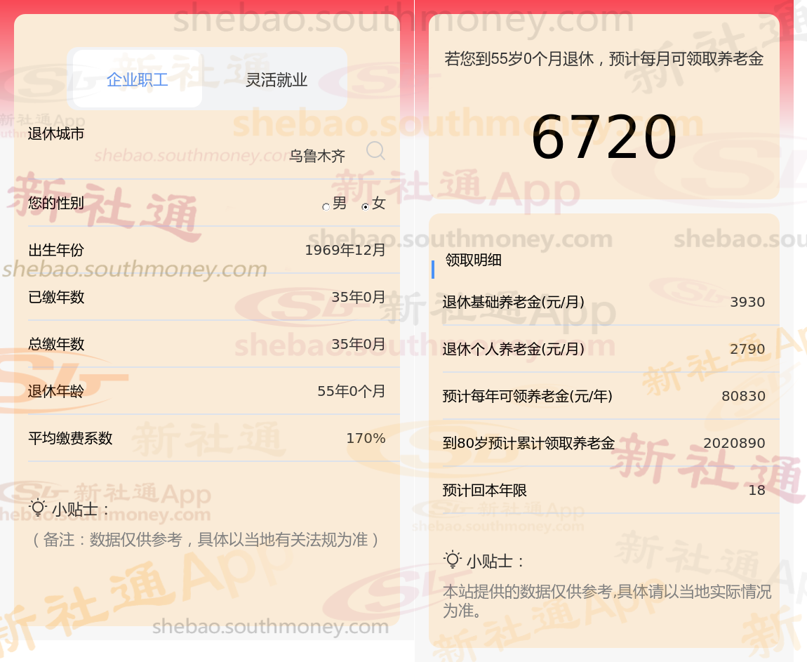 退休城市:乌鲁木齐,性别:女,出生年份:1969,总缴年数35年,缴费档次:170%,新社通app养老金计算器所得:
