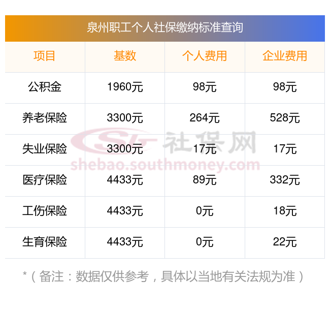 2024年泉州社保缴费多少钱?下表是2023-2024年泉州社保费用明细参考,新社通app-社保缴费查询工具提供的最新数据如下: