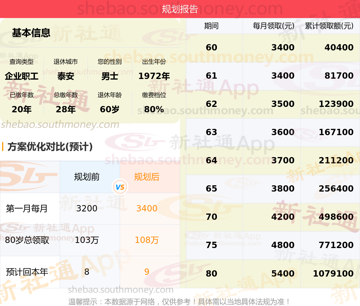 规划前:参保城市:山东泰安,性别:男士,出生年月:1972,已缴年限:20年,总缴年数:28年,退休年龄:60岁,缴费档位:80%。