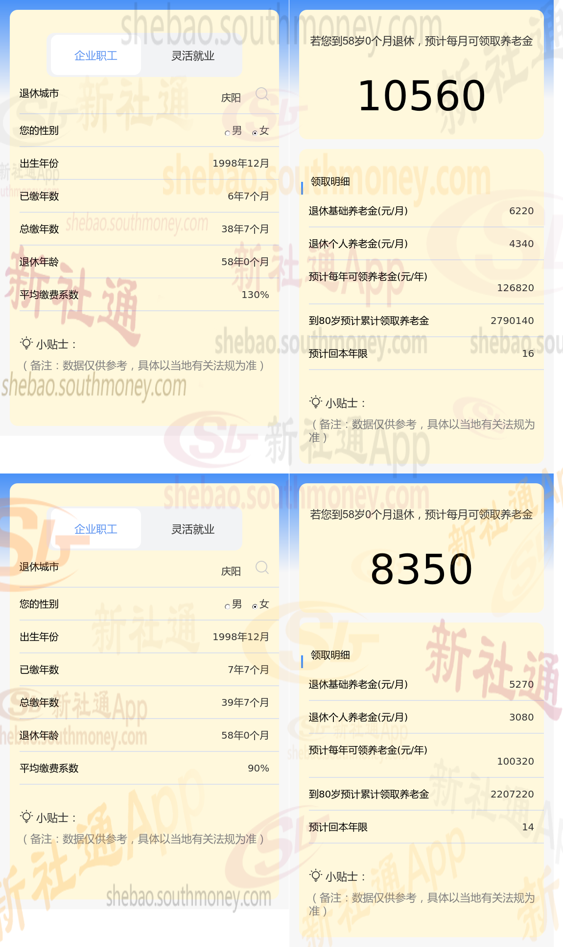 根据新社通app养老金计算器,轻松测算您的养老金!计算结果显示,张某与老周的养老金差距源于缴费年限和缴费档位的差异,这一差距具体体现在数额上,张某的10560元减去老周的8350元,等于2210元。