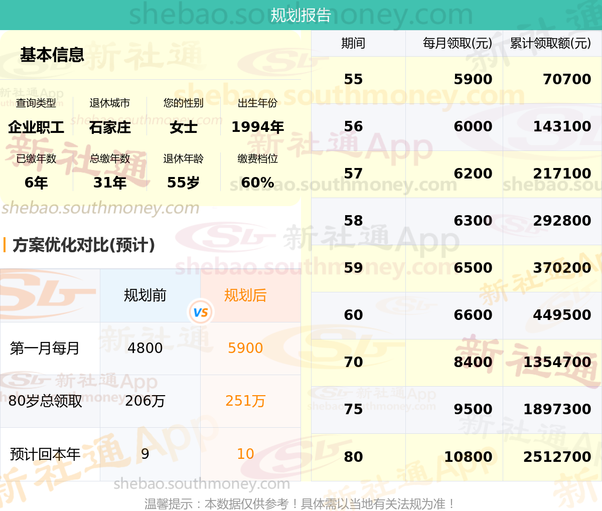 规划前:55岁第一个月约领4800元,新社通APP-养老金规划后:55岁第一个月约领5900元