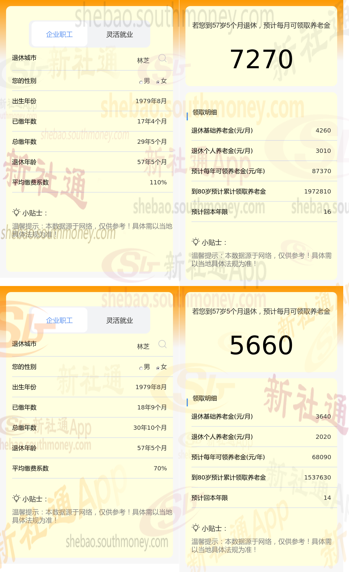 以林芝为具体案例(在此新社APP暂不将过渡养老金纳入考量):康某在林芝退休,其社保缴费的累计年数为29年,于57周岁时正式步入退休生活,且一直以来,他都按照110%的缴费档位进行社保缴纳。