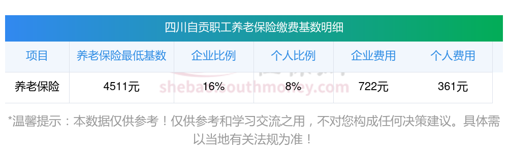 2024年四川自贡城镇职工基本养老保险缴费基数的下限为4511元。四川自贡职工基本养老保险由用人单位和职工分别按其缴费基数的16%和8%按月共同缴纳。四川自贡养老金一个月缴费金额如下: