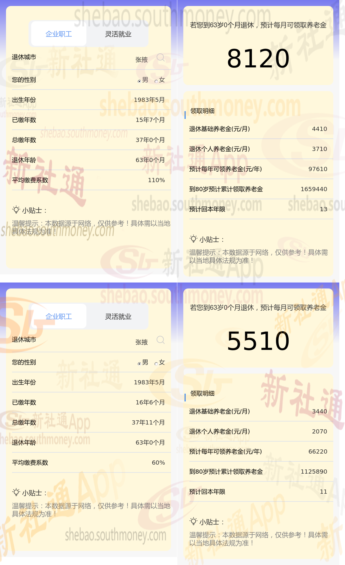 根据新社通app养老金计算器,轻松测算您的养老金!经过计算发现,秦某与老周的在养老金上的差异,主要是由于他们的缴费年限和缴费档位不同所导致的。具体来说,两者的养老金差额达到了2610元,即秦某的8120元减去老周的5510元。