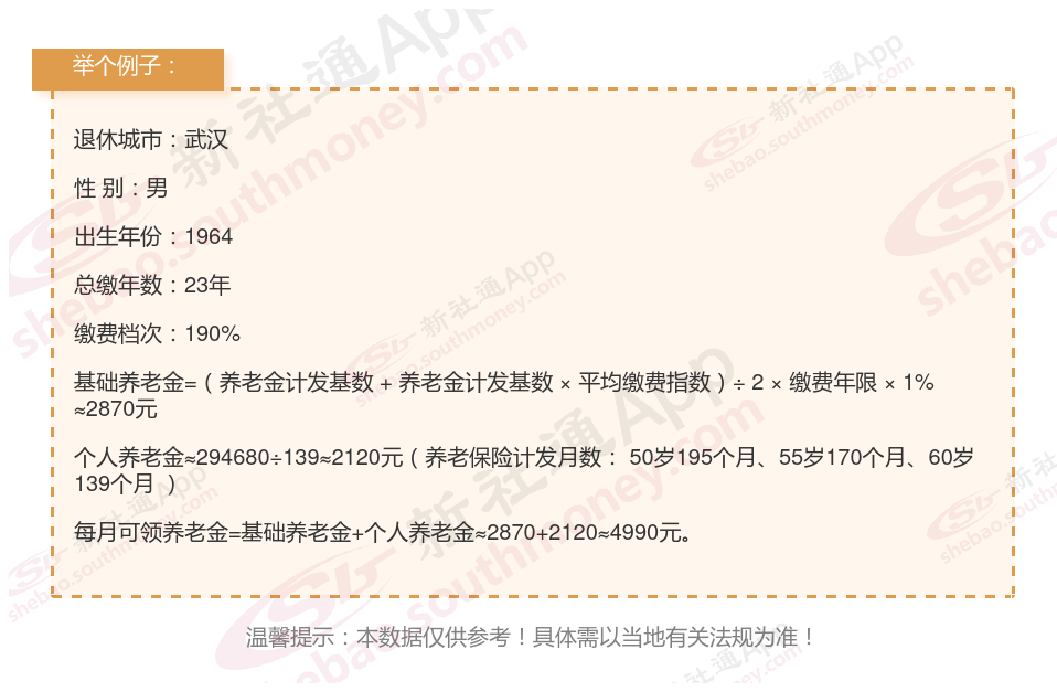 网友杨某退休城市在武汉,性别:男,出生年份:1964,总缴年数23年,缴费档次:190%