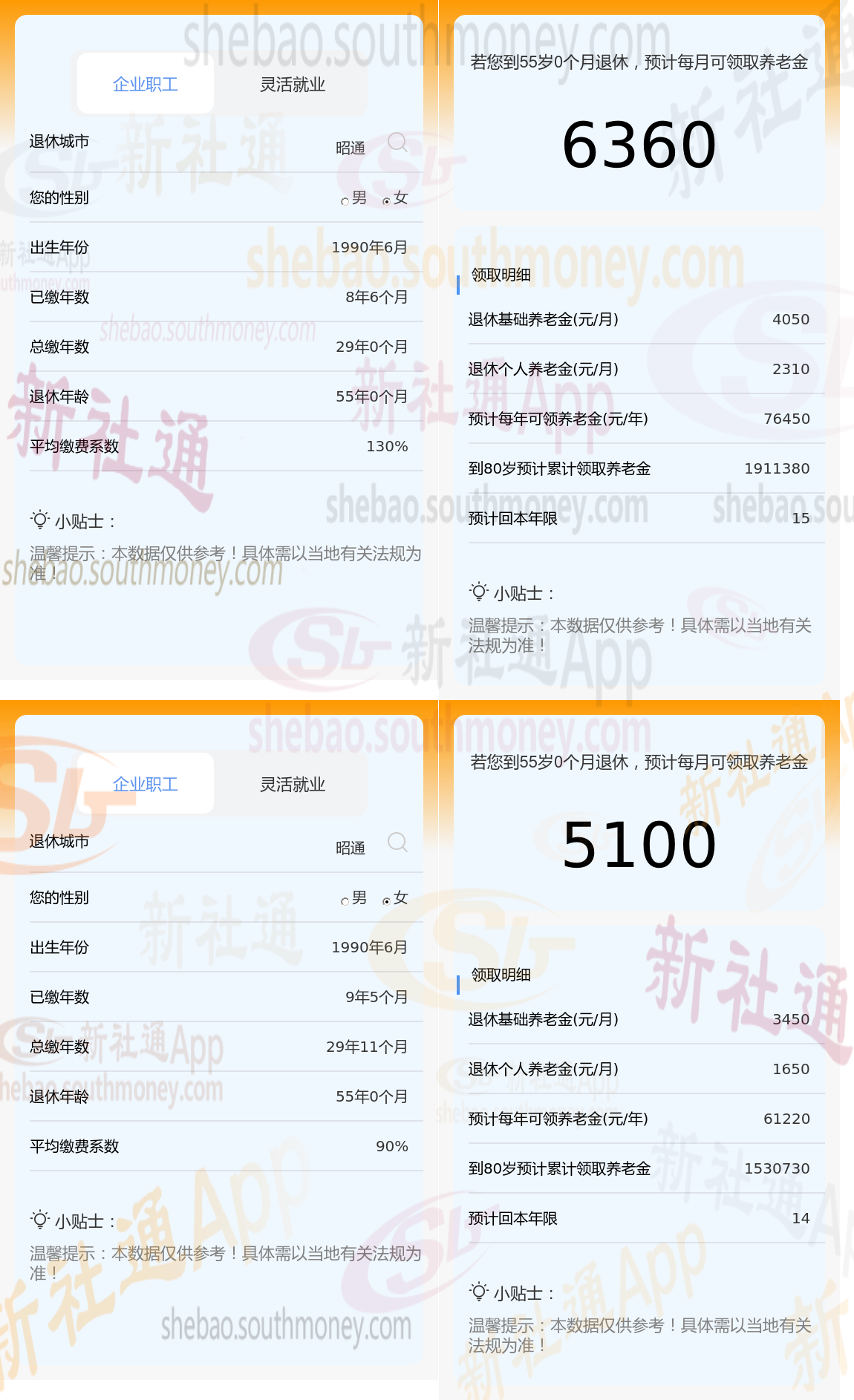 老何:退休城市昭通,缴费年限29年,退休年龄55周岁,但是按90%缴纳社保。