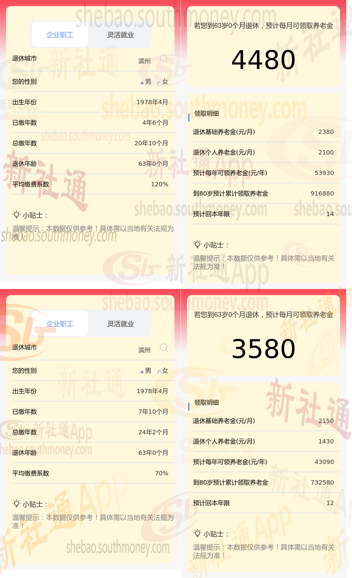 根据新社通app养老金计算器,轻松测算您的养老金!计算结果显示,张某与老周的养老金差距源于缴费年限和缴费档位的差异,这一差距具体体现在数额上,张某的4450元减去老周的3550元,等于900元。