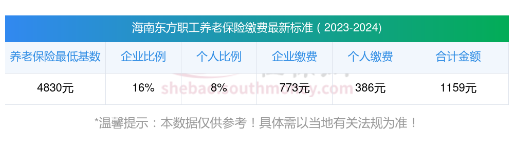 假设海南东方的养老保险缴费基数为4830元,个人按照8%的比例缴纳养老保险费用,企业按照16%的比例缴纳。则该职工的养老保险缴费计算如下: