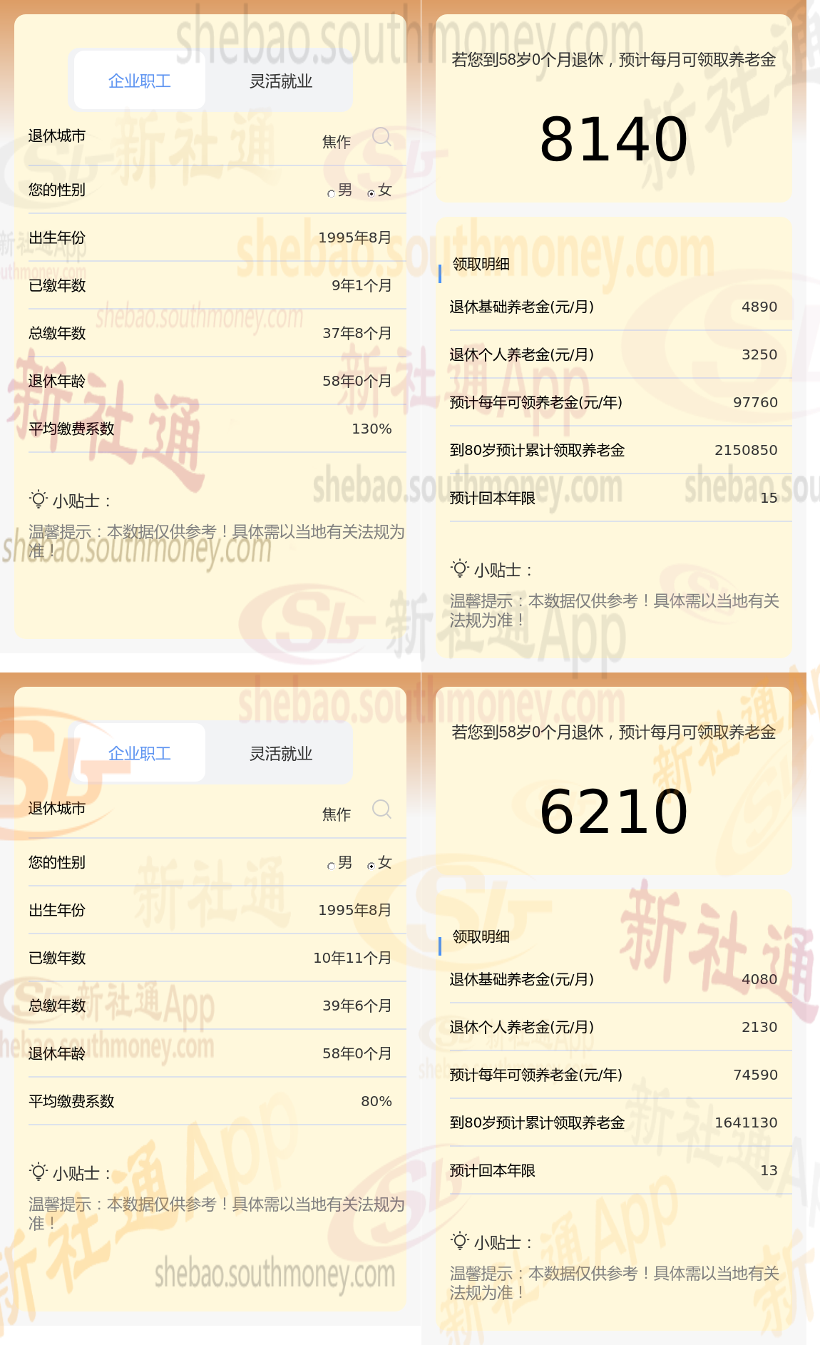根据新社通app养老金计算器,轻松测算您的养老金!计算结果显示,张某与老冯的养老金差距源于缴费年限和缴费档位的差异,这一差距具体体现在数额上,张某的8140元减去老冯的6210元,等于1930元。