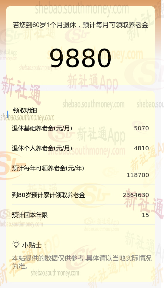 养老金总额:基础养老金 + 个人养老金 = 9880元/月。