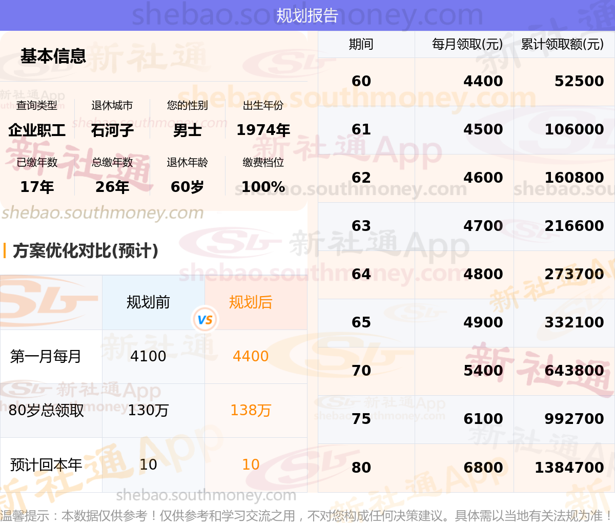 规划前:参保城市:新疆石河子,性别:男士,出生年月:1974,已缴年限:17年,总缴年数:26年,退休年龄:60岁,缴费档位:100%。