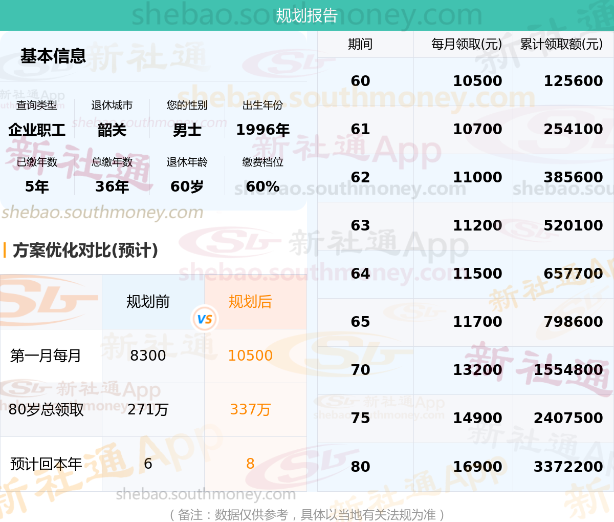 规划前:60岁第一个月约领8300元,新社通APP-养老金规划后:60岁第一个月约领10500元