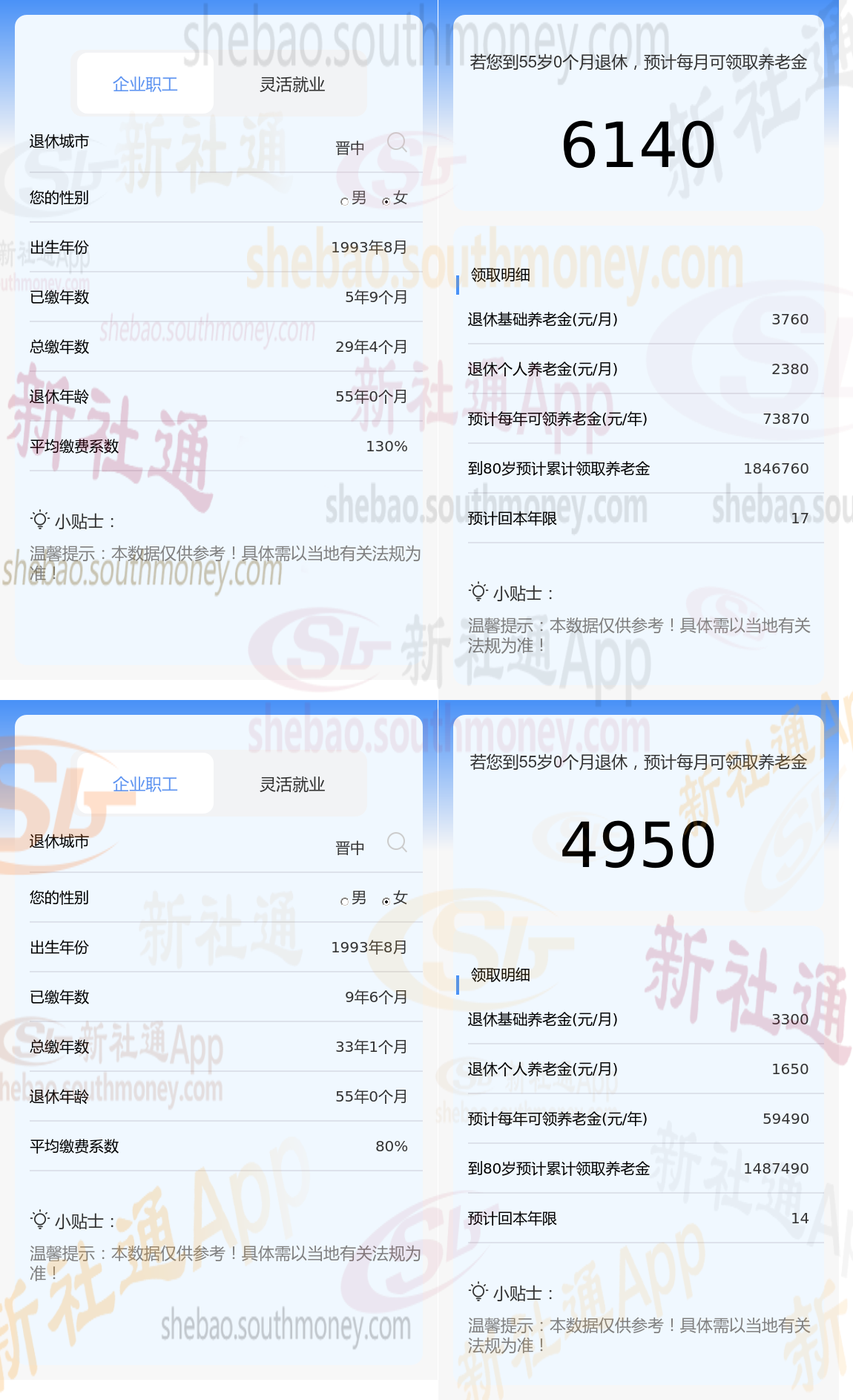 根据新社通app养老金计算器,轻松测算您的养老金!经过计算发现,夏某与老秦的在养老金上的差异,主要是由于他们的缴费年限和缴费档位不同所导致的。具体来说,两者的养老金差额达到了1190元,即夏某的6140元减去老秦的4950元。