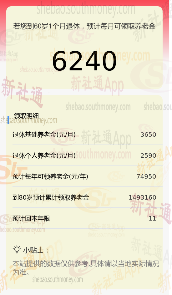 每月可领养老金=基础养老金+个人养老金≈3650+2590≈6240元