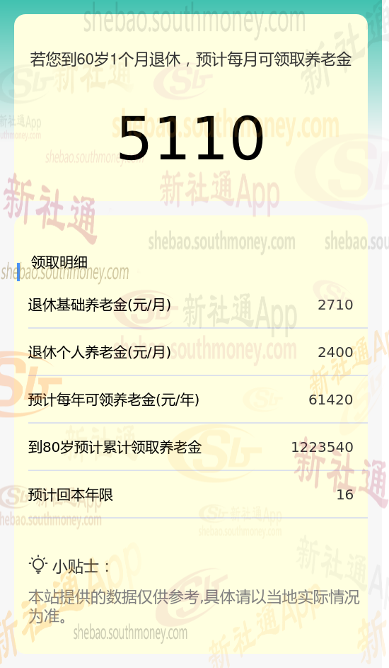 总养老金月度领取额:将基础养老金和个人养老金相加,得出每月可领取的养老金总额大约为5110元(即2710元基础养老金+2400元个人养老金)。