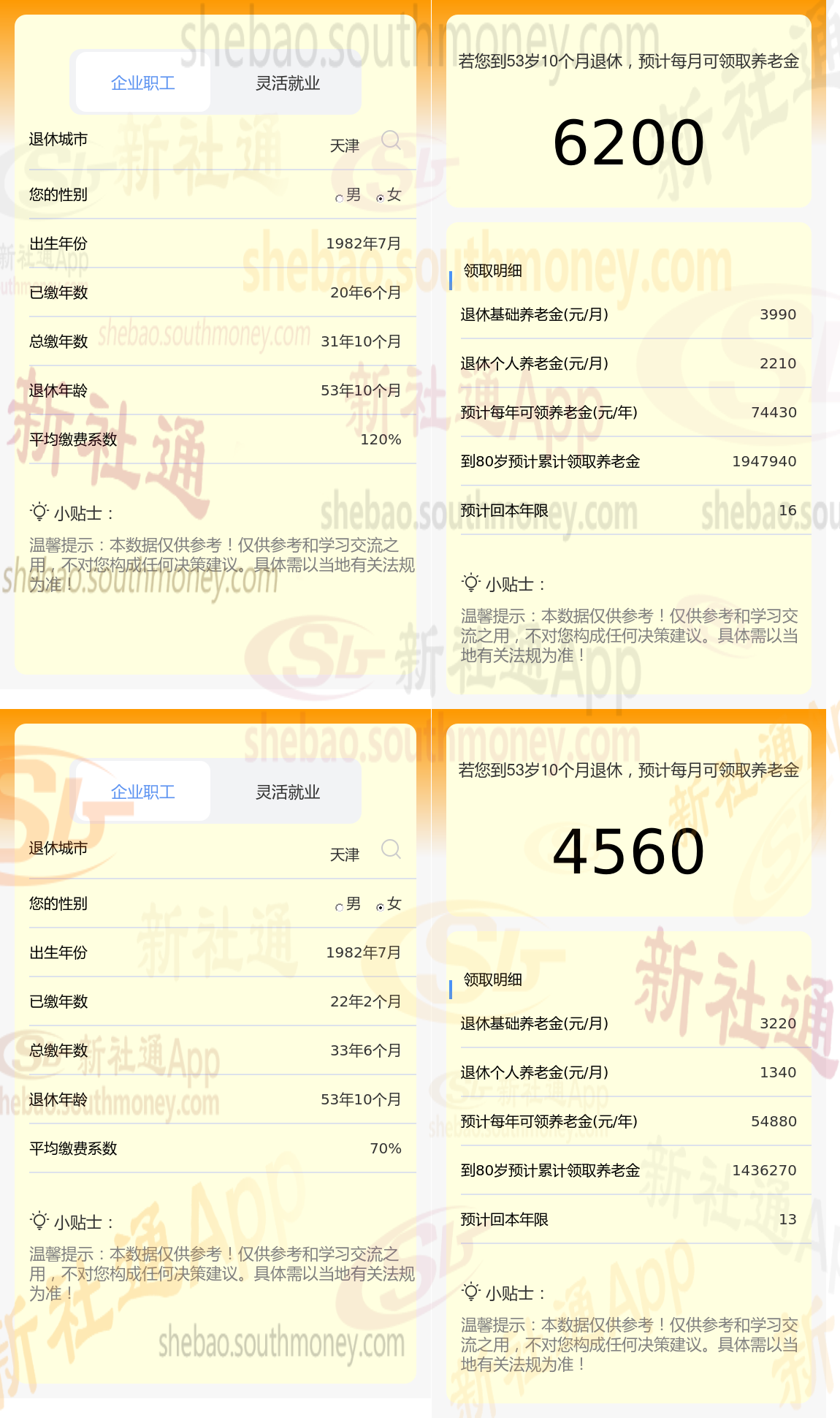 以天津这座城市作为背景,新社小编来对比两位退休人员的养老金情况: 第一位是孔某,他在天津退休,社保缴费的年限达到了31年,于53周岁时退休,且他一直是按照120%的缴费档位进行缴纳的。 另一位是老赵,同样在天津退休,但他的缴费年限稍长,为33年,也是在53周岁时退休。不过,与孔某,不同的是吕某是按照70%的比例来缴纳社保的。 (注:此讨论中,新社小编暂不考虑过渡养老金。)