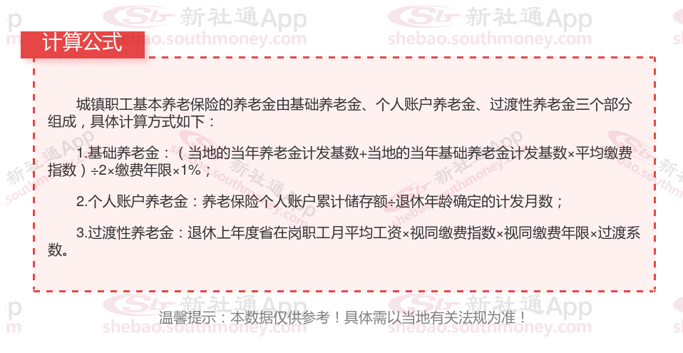基本养老金=(退休时上年度全市城镇单位就业人员月平均工资+本人指数化月平均缴费工资)÷2×缴费年限×1%。