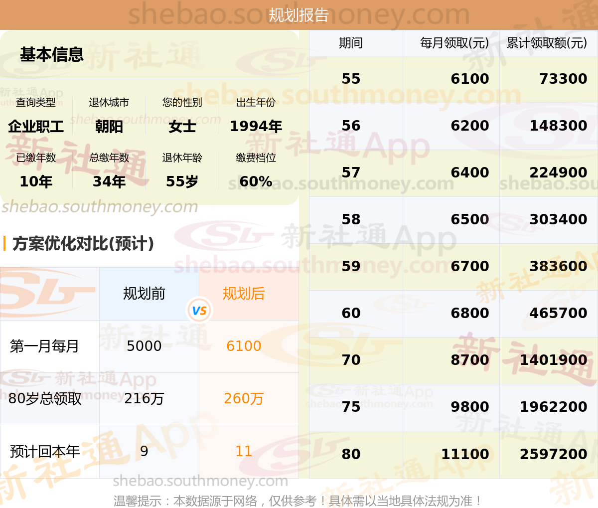 规划前:55岁第一个月约领5000元,新社通APP-养老金规划后:55岁第一个月约领6100元