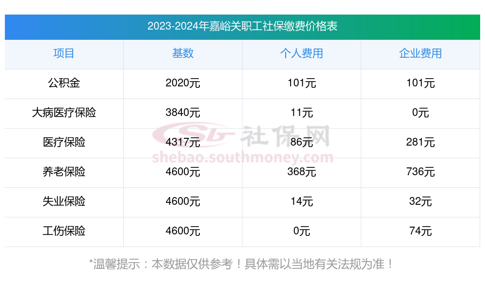 2025年嘉峪关社保缴费多少钱?下表是2023-2024年嘉峪关社保费用明细参考,如下: