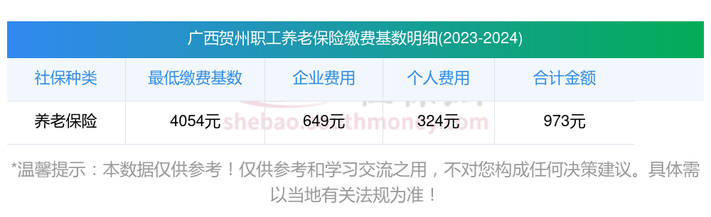 养老保险一个月要交多少钱?广西贺州缴费基数2023-2024年最新标准(最低)