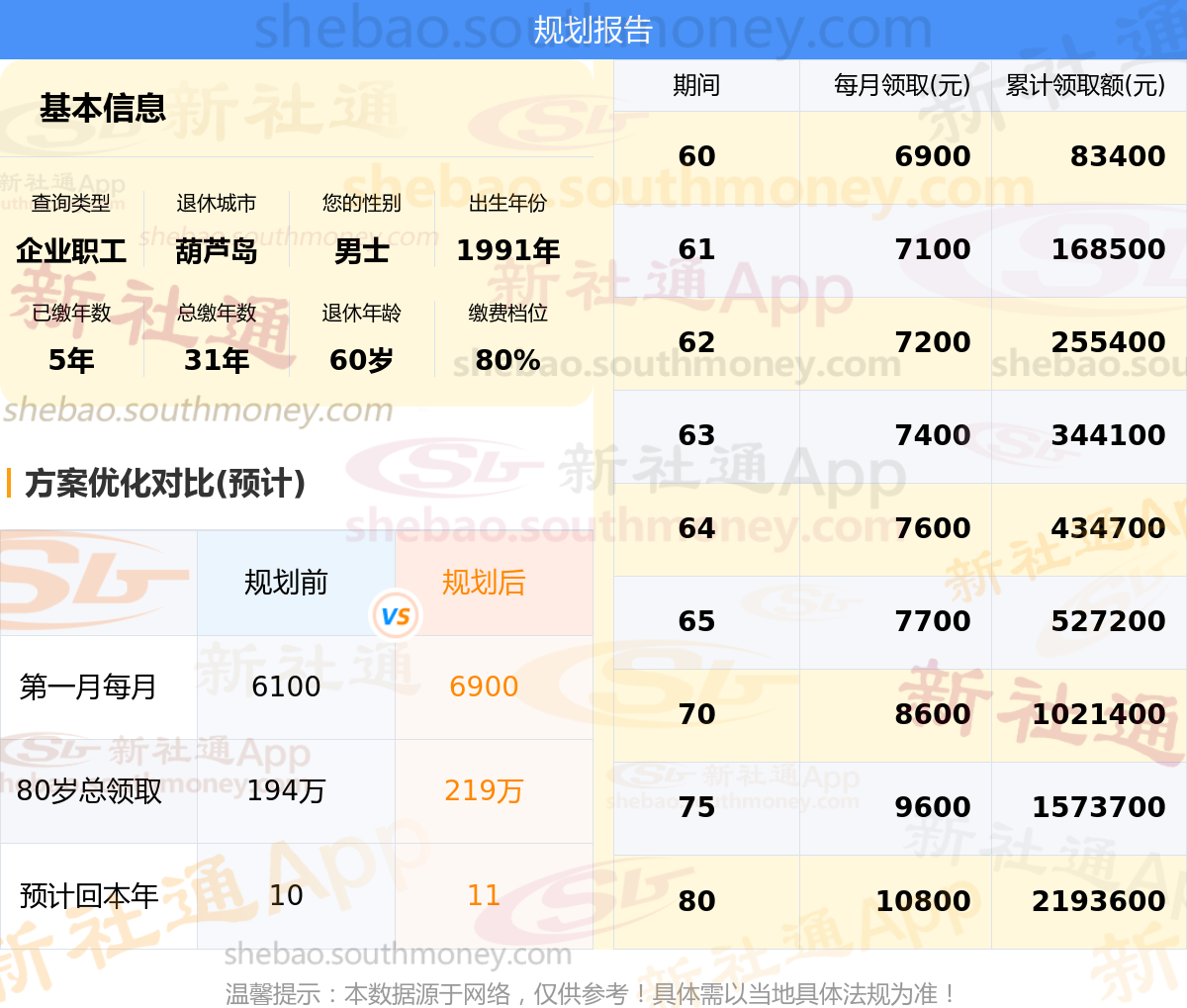 规划前:60岁约领6100元,新社通APP-养老金规划后:60岁约领6900元