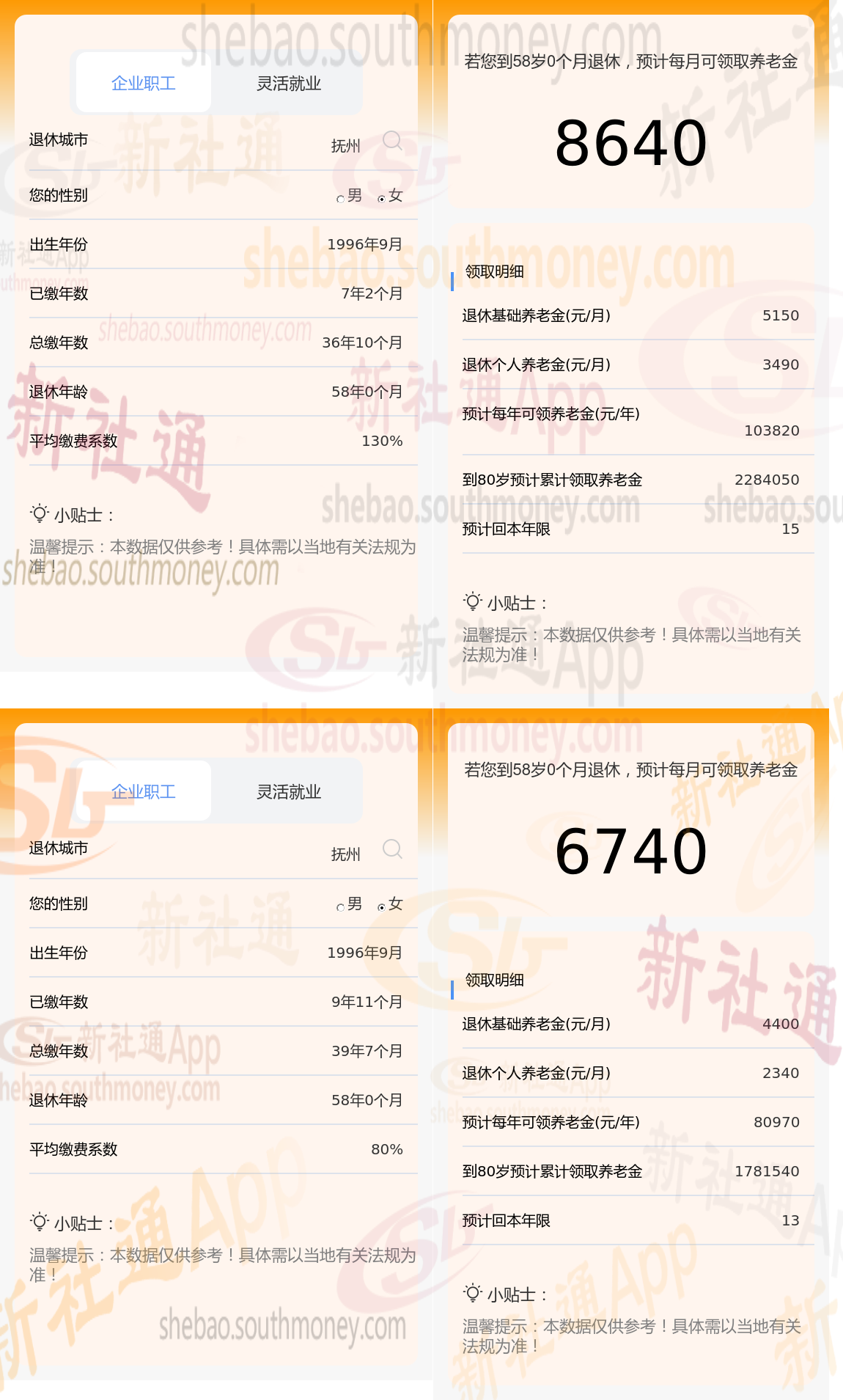 新社通app养老金计算器,轻松测算您的养老金!:两者相差8640-6740=1900元。