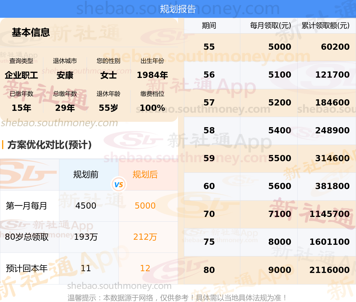 规划前:55岁每月约领4500元,新社通APP-养老金规划后:55岁每月约领5000元