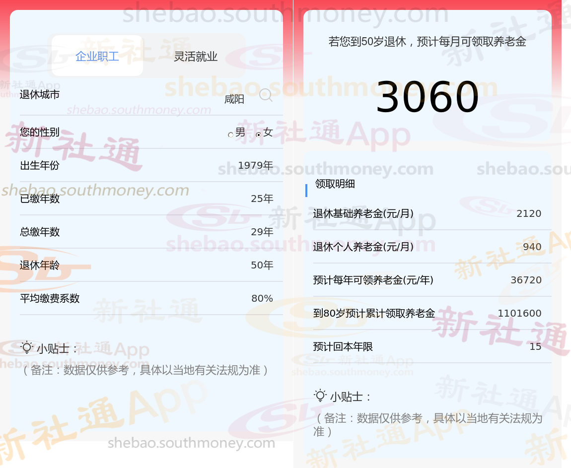 通过新社通APP-养老金计算所得:在保持退休城市、出生年份、退休年龄以及缴费系数这些条件不变的前提下,当个人的社保缴费年限累积达到29年时,其相关计算方式如下: