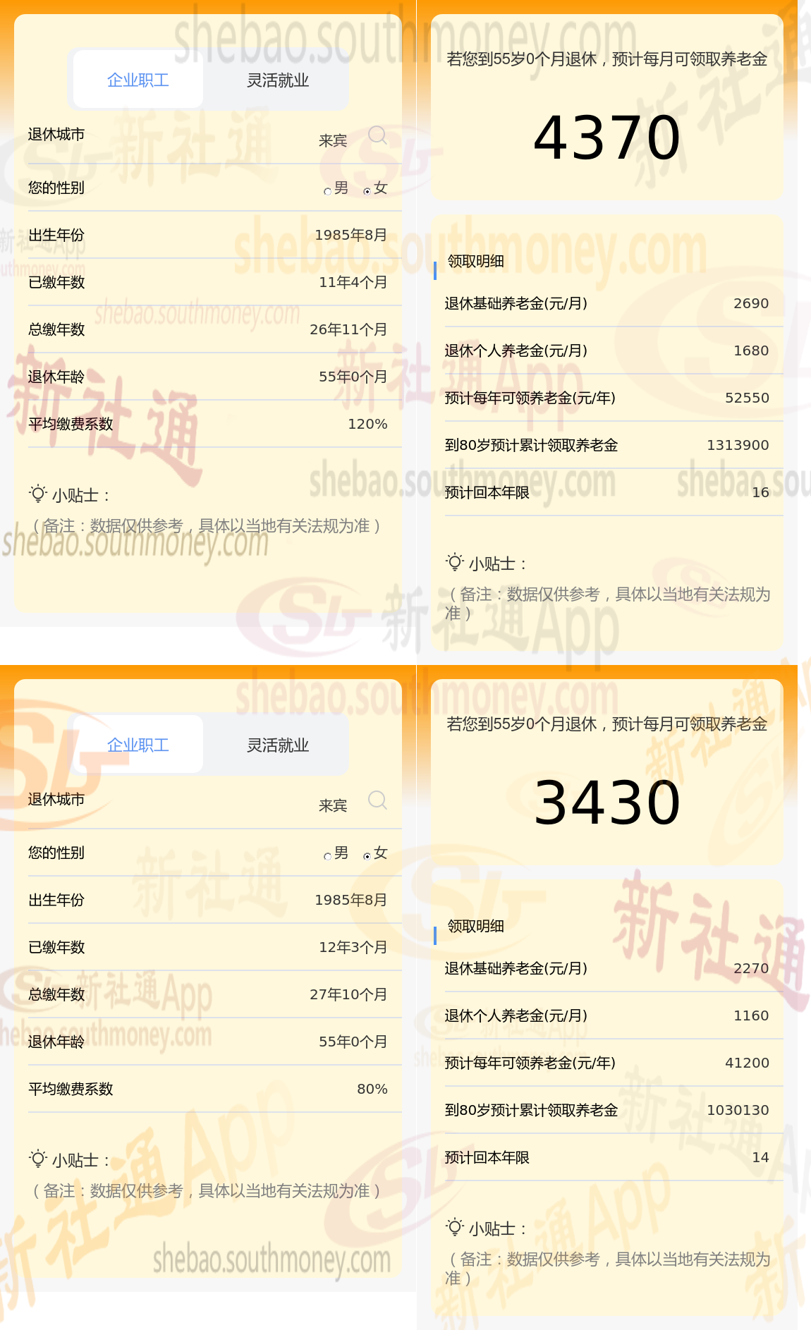 以来宾这座城市作为背景,社保网app来对比两位退休人员的养老金情况: 第一位是张某,他在来宾退休,社保缴费的年限达到了26年,于55周岁时退休,且他一直是按照120%的缴费档位进行缴纳的。 另一位是老秦,同样在来宾退休,但他的缴费年限稍长,为27年,也是在55周岁时退休。不过,与张某,不同的是吕某是按照80%的比例来缴纳社保的。 (注:此讨论中,社保网app暂不考虑过渡养老金。)