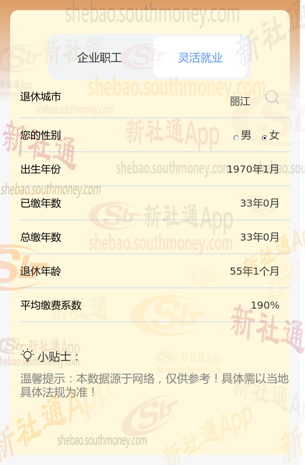 近日,丽江一位女性灵活就业退休人员向我们咨询,她1970年出生的,拥有33年的工龄。她提到自己的养老保险每月按照190%档位缴纳,并询问据此估算,每月能领取的养老金能否超过6300元。