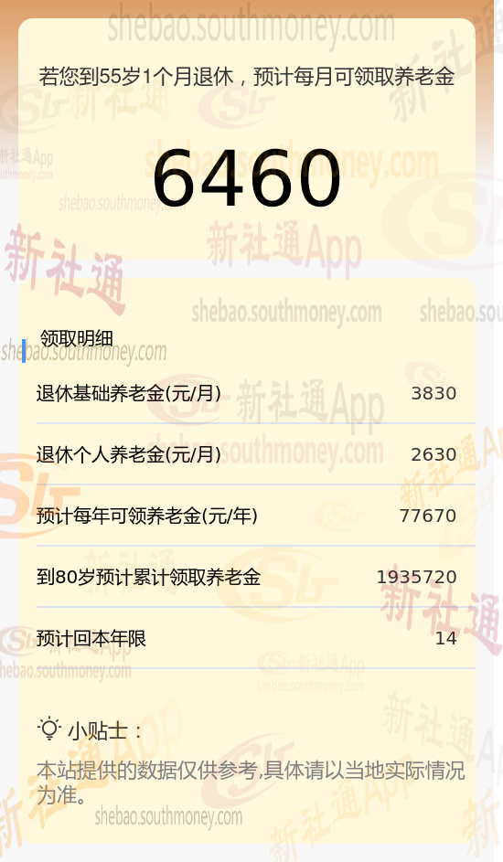 每月可领养老金总额:将基础养老金与个人养老金相加,每月可领取的养老金总额约为6460元(3830元+2630元)。