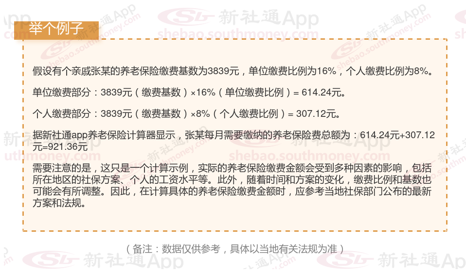 据新社通app养老保险计算器显示,小明每月需要缴纳的养老保险总金额为614.24元(企业部分)+ 307.12元(个人部分)= 921.36元。