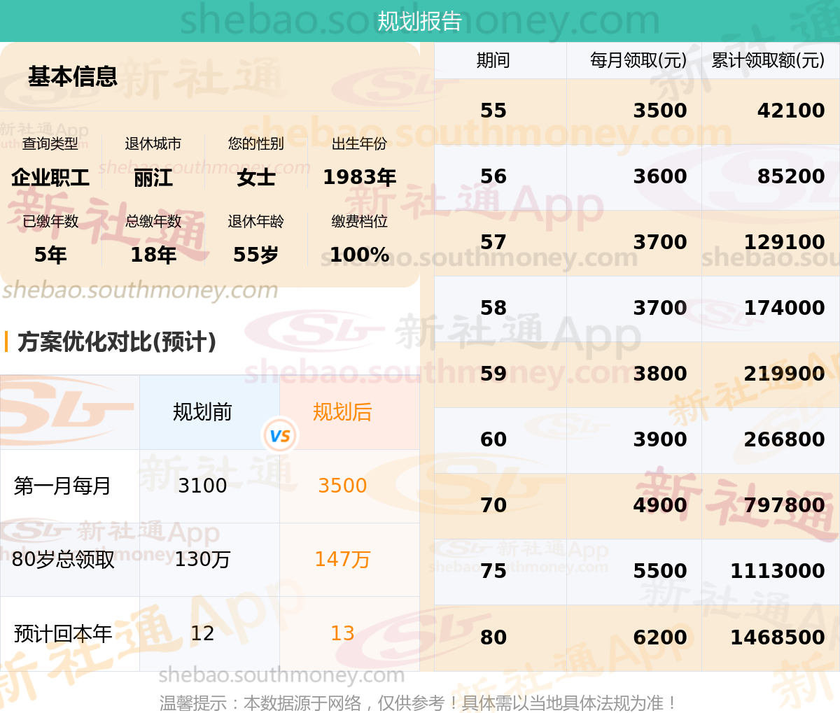规划前:参保城市:云南丽江,性别:女士,出生年月:1983,已缴年限:5年,总缴年数:18年,退休年龄:55岁,缴费档位:100%。
