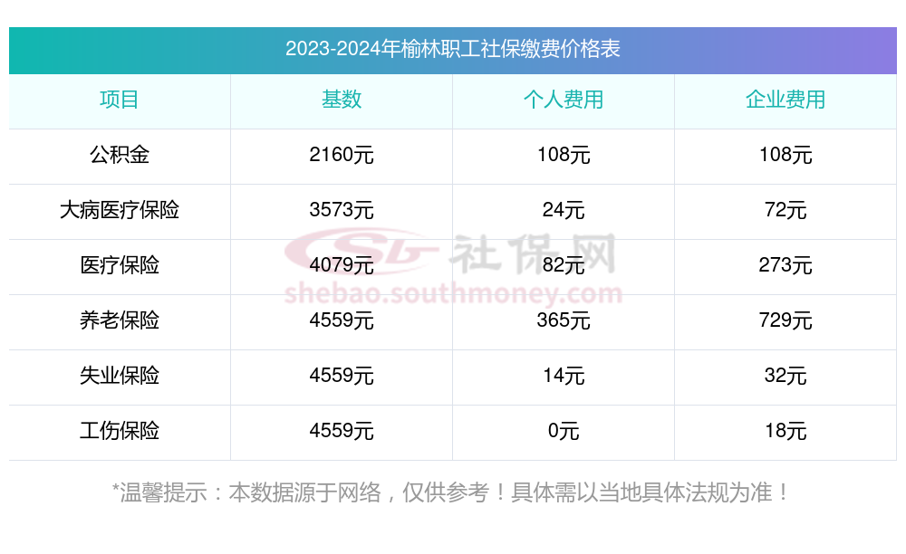 2025年榆林社保缴费多少钱?下表是2023-2024年榆林社保费用明细参考,如下: