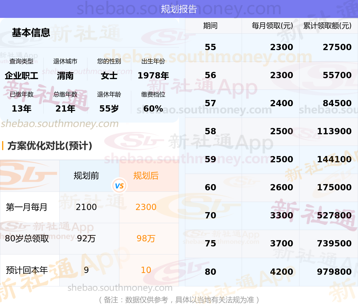 规划前:55岁根据最新的退休退休金由两部分组成:养老金=基础养老金+个人账户养老金根据新社小编计算出每月养老金为2100元。