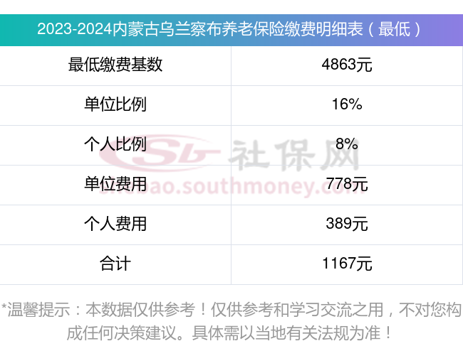 内蒙古乌兰察布养老保险最低缴费基数:4863元;