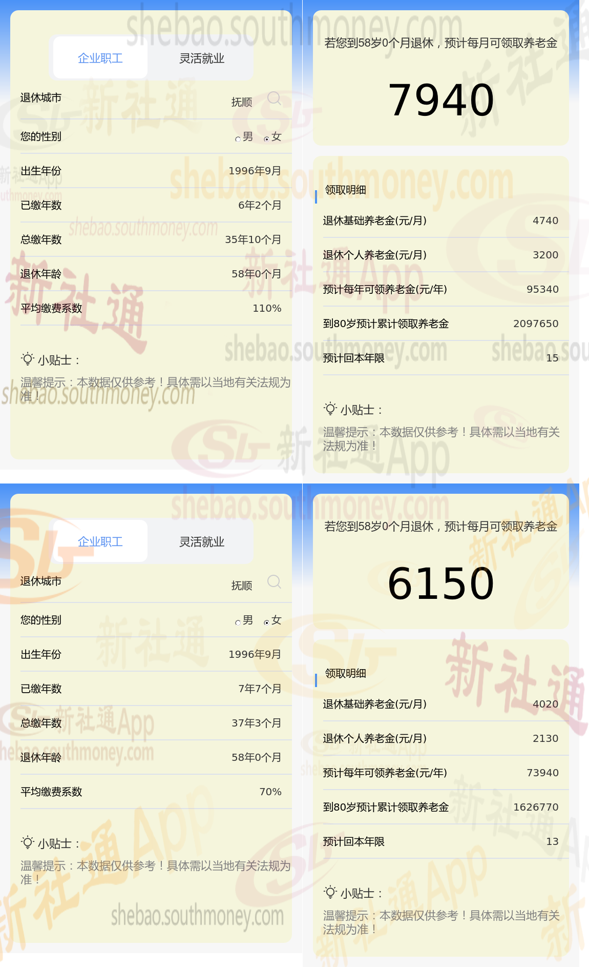 下面社保网一起来看下,以抚顺为例(不考虑过渡养老金):