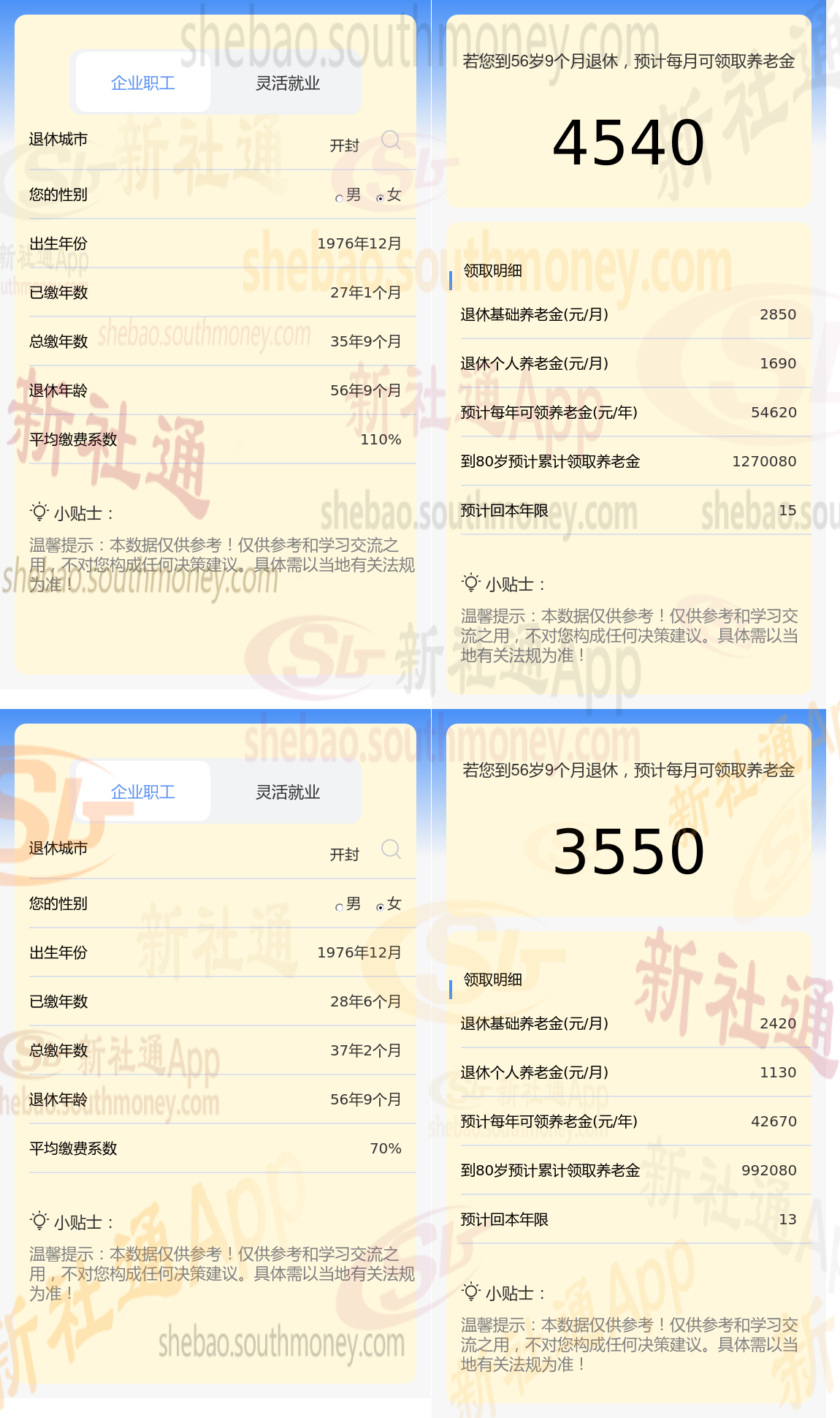 根据新社通app养老金计算器,轻松测算您的养老金!经过计算发现,希某与老韩的在养老金上的差异,主要是由于他们的缴费年限和缴费档位不同所导致的。具体来说,两者的养老金差额达到了990元,即希某的4540元减去老韩的3550元。