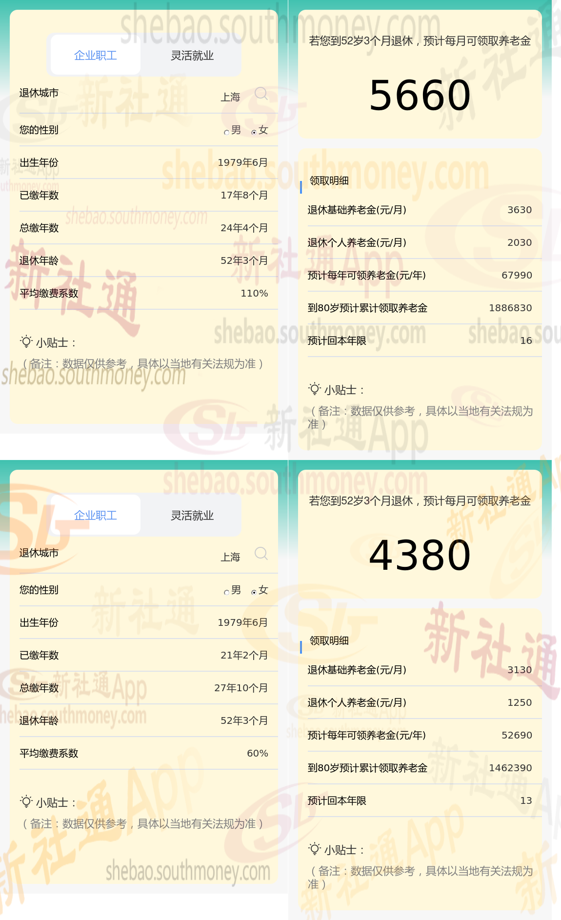 新社通app养老金计算器,轻松测算您的养老金!:两者相差5660-4380=1280元。