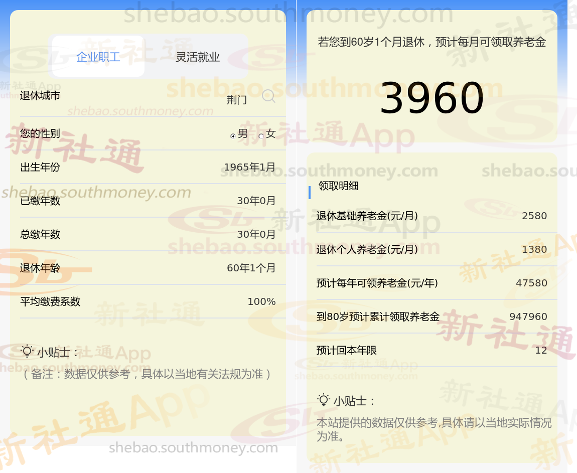 退休城市:荆门,性别:男,出生年份:1965,总缴年数30年,缴费档次:100%,新社通app养老金计算器所得: