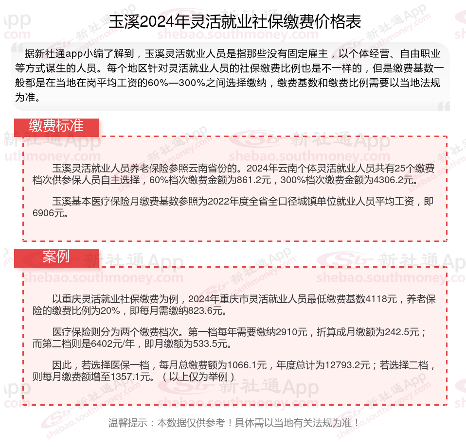 据新社通app数据显示,玉溪灵活就业养老保险缴费基数2024-2025年最新标准如下: