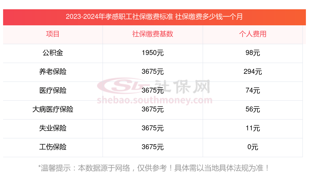 2025年孝感社保缴费多少钱?下表是2023-2024年孝感社保费用明细参考,新社通app-社保缴费查询工具提供的最新数据如下: