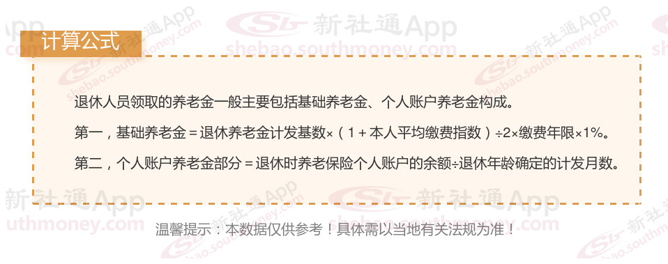 基础养老金=退休时上年度全市城镇单位就业人员月平均工资×(1+本人月平均缴费工资指数)÷2×缴费年限×1%