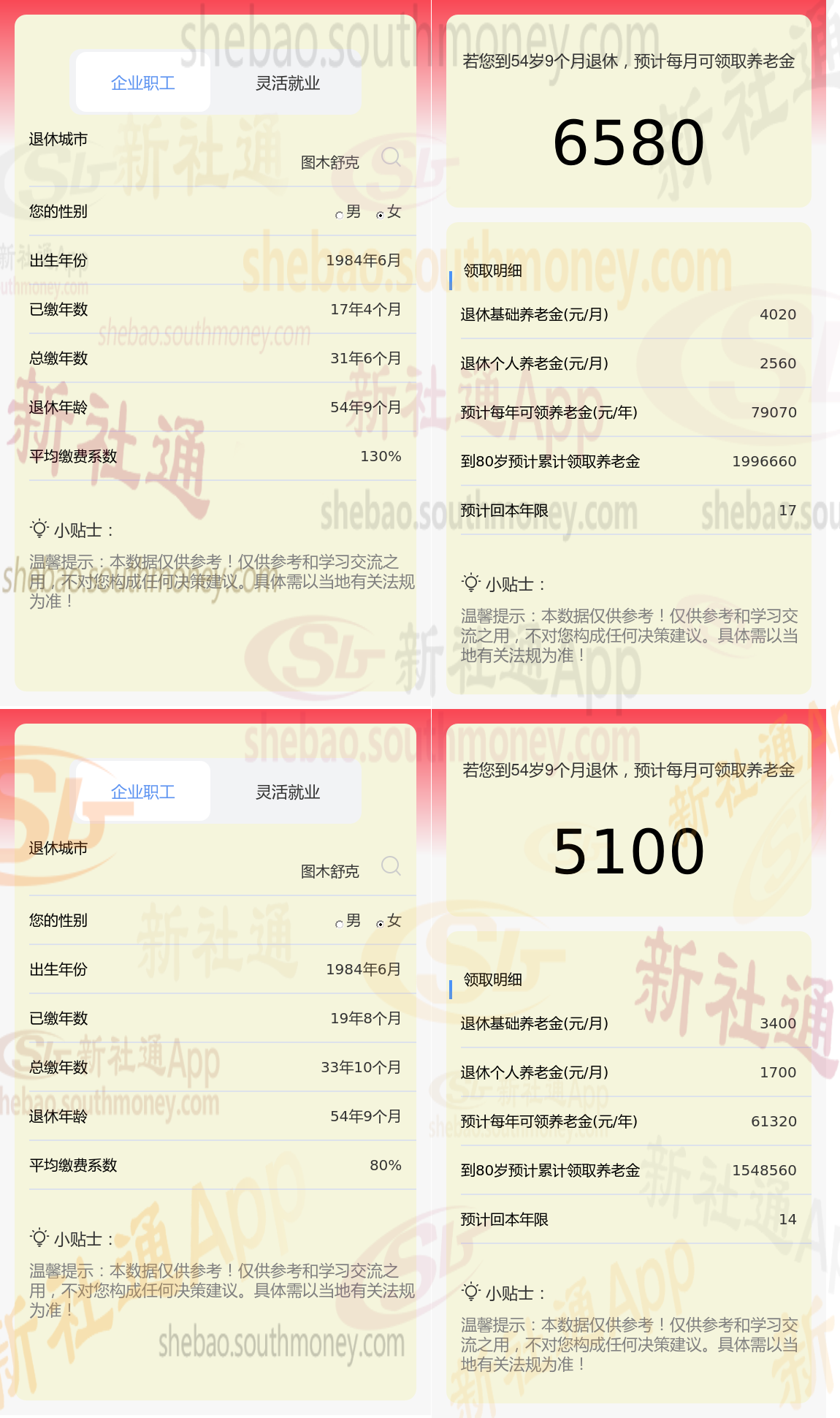 老柯:退休城市图木舒克,缴费年限33年,退休年龄54周岁,但是按80%缴纳社保。