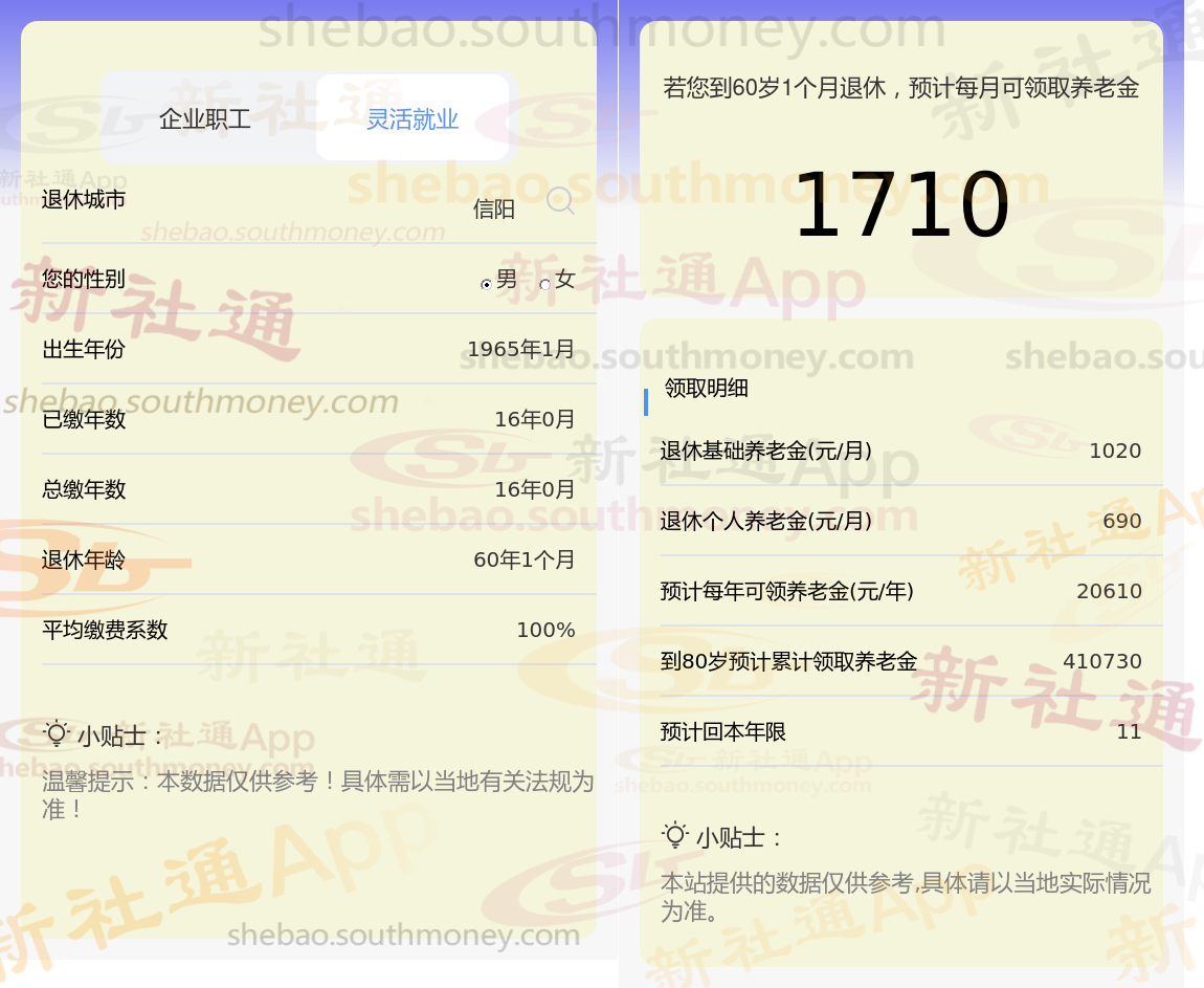 朋友林某退休城市在信阳,性别:男,出生年份:1965,总缴年数16年,缴费档次:100%,新社通app养老金计算器所得: