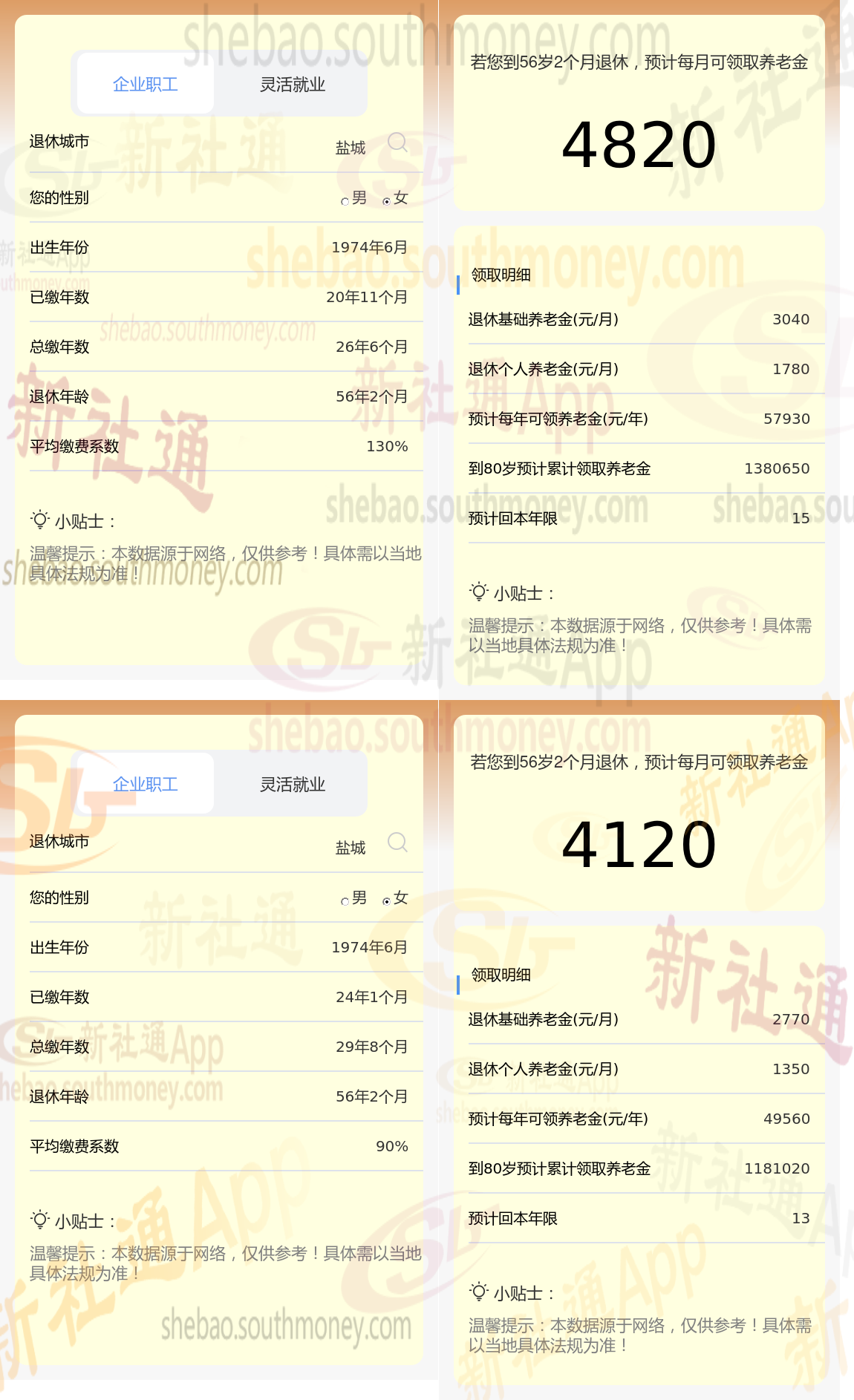 希某:退休城市盐城,社保缴费年限26年,56周岁退休,按130%缴费档位。