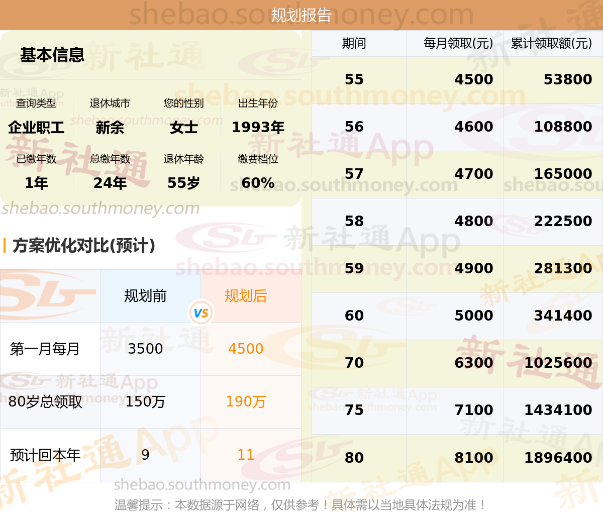 规划前:参保城市:江西新余,性别:女士,出生年月:1993,已缴年限:1年,总缴年数:24年,退休年龄:55岁,缴费档位:60%。