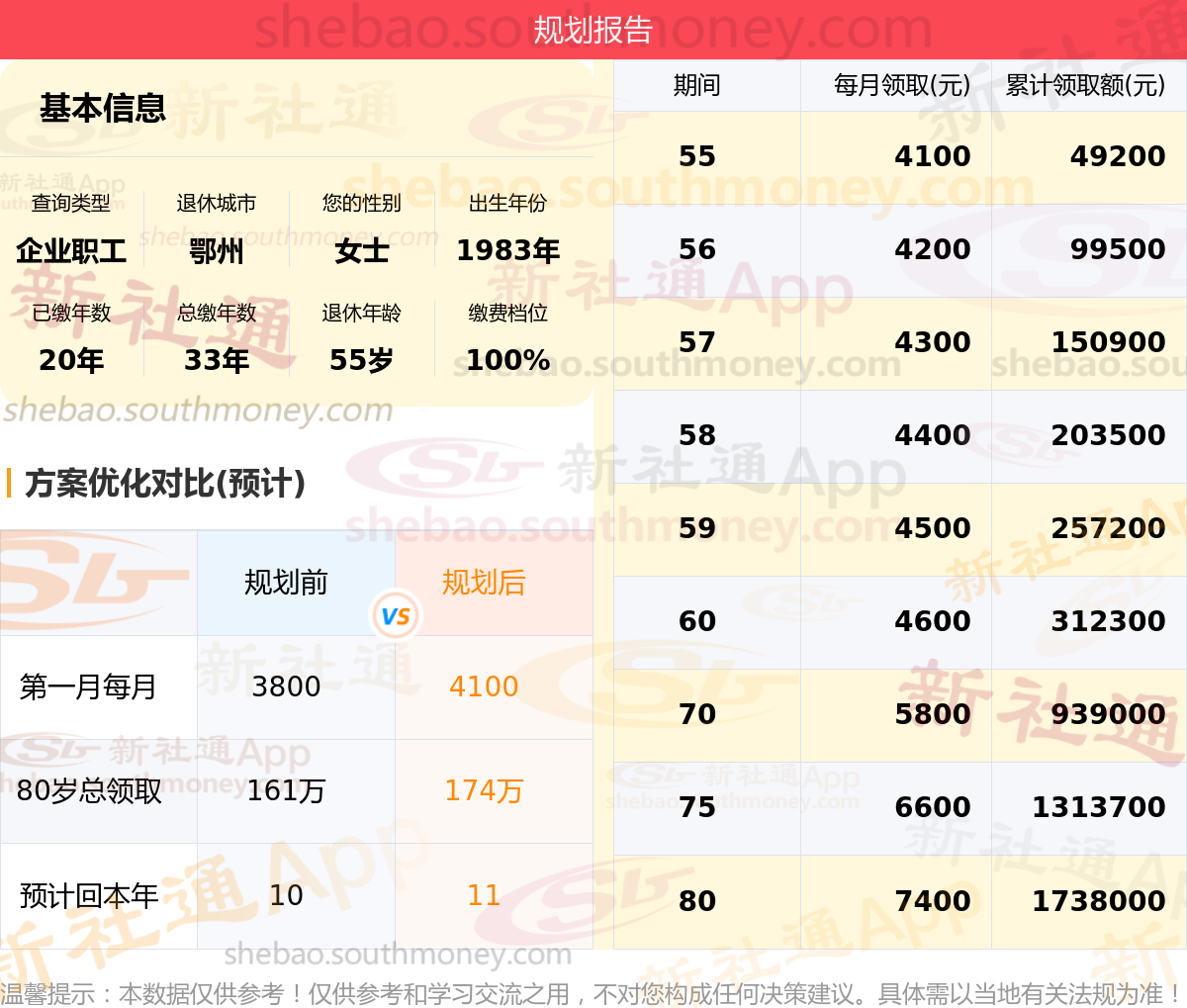 规划前:55岁第一个月约领3800元,新社通APP-养老金规划后:55岁第一个月约领4100元