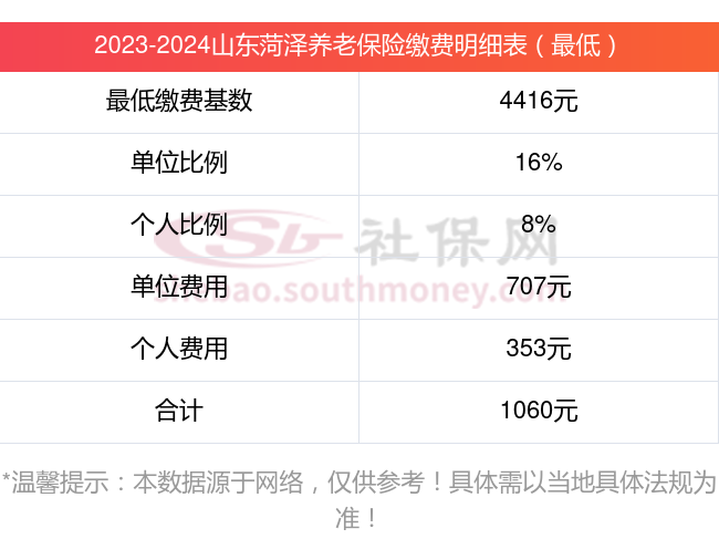 山东菏泽养老保险缴费基数2023-2024年最新标准(最低)