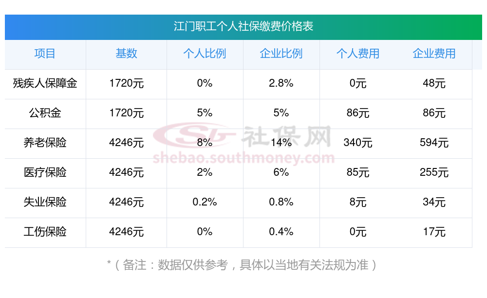 2025年江门社保缴费多少钱?下表是2024-2025年江门社保费用明细参考,新社通app-社保缴费查询工具提供的最新数据如下: